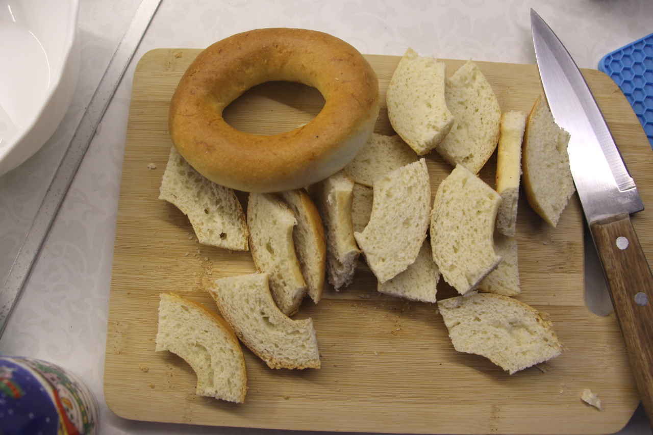 1. Нарезать баранку пополам, а затем на ломтики, как показано на фотографии.